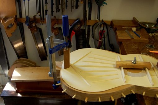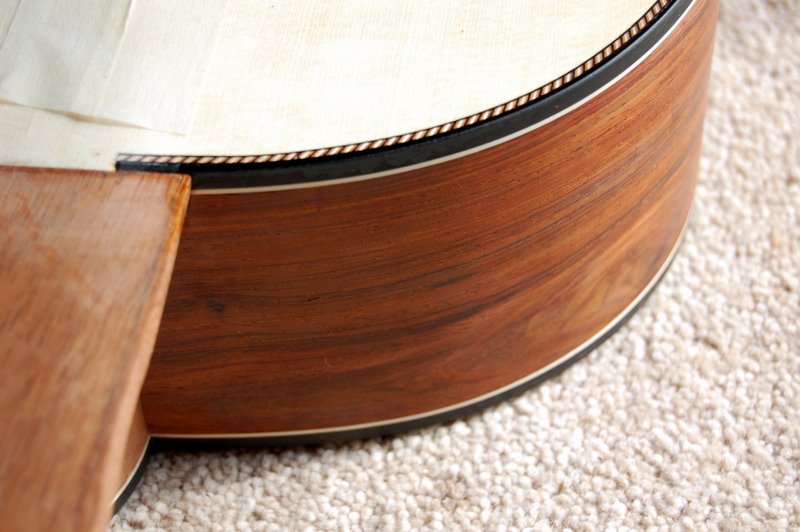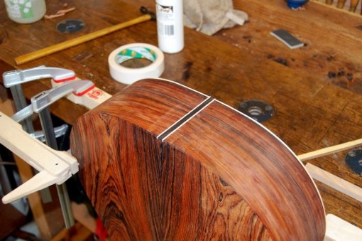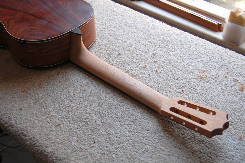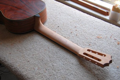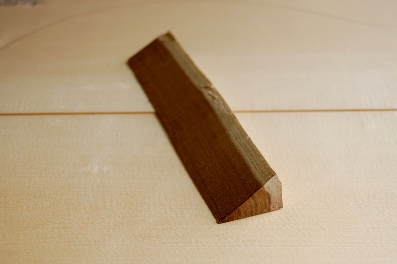 The fingerboard has now been fitted and fretted to a scale length of 650mm. I’ve more or less finalized the shape of the neck too. Time to make the bridge.