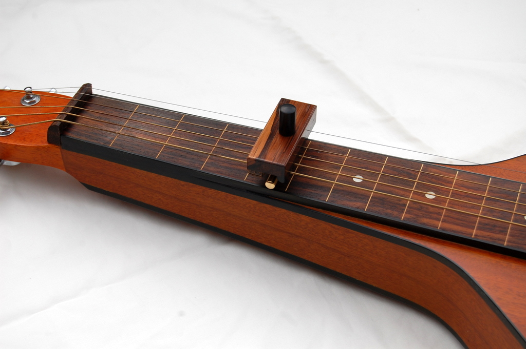 A while ago, a friend bought himself a lap steel guitar – the sort with a hollow neck, square in section – but became frustrated because he couldn’t find a capo that would fit it. He couldn’t use the usual type of capo, of course, because the hollow neck of the guitar was too thick and too fragile to allow the clamp to work and because the strings were too high over the fingerboard. So I made him this device, which is easy to fit and adjust and works well.