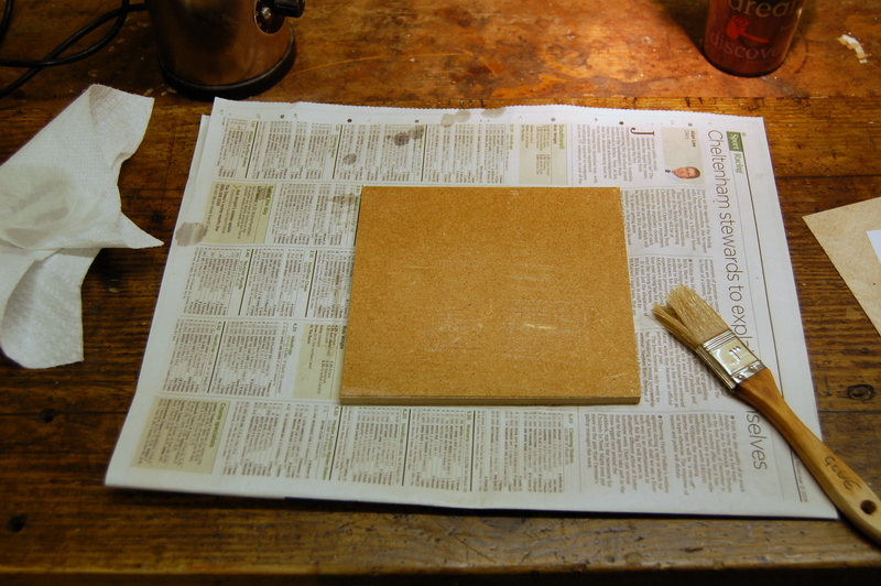 One surface of the square of MDF is given a thin coat of hot hide glue.