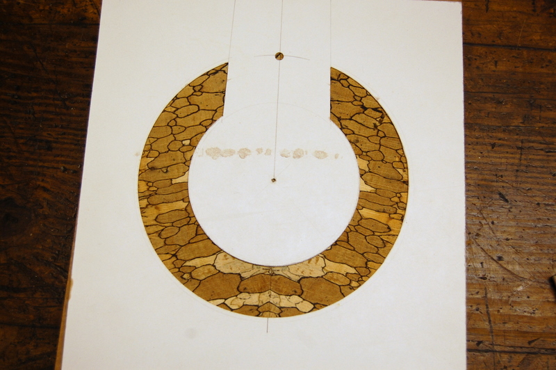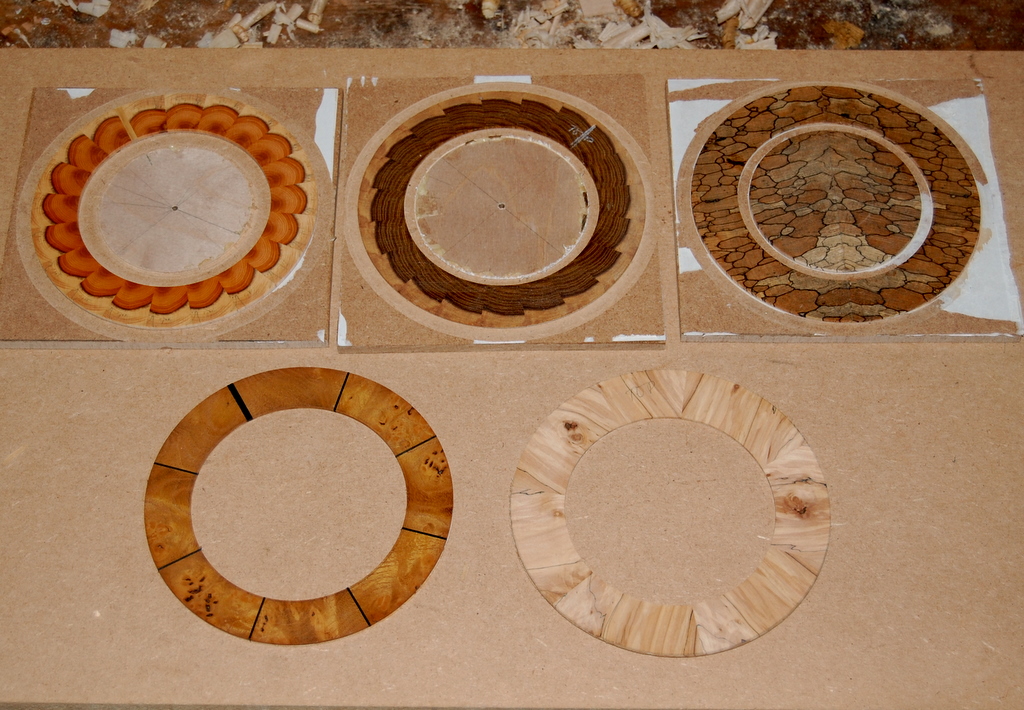 For reasons that I’ve discussed before, I like the visual effect of rosettes made by inlaying wood with contrasting colours or a striking figure and often use this technique when making guitars.