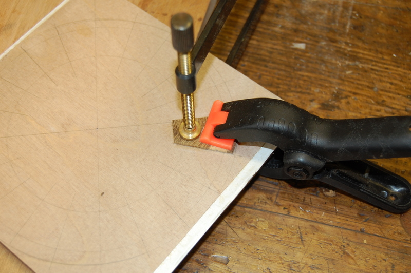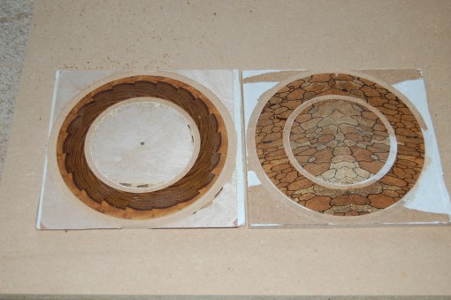 These rosettes are made from at least 2, and usually many more, individual pieces and I’ve found that it’s much easier to assemble them accurately on a base of thin birch plywood (0.4mm or 0.6mm thick*) than it is to inlay them directly on the soundboard. Because the plywood is so thin, it too needs a stable base during the assembly process. But, of course, it must be possible to remove this base when assembly is complete. I start with a square of 6mm MDF, a similarly sized sheet of clean paper and the square of plywood that will be the permanent base of the rosette.