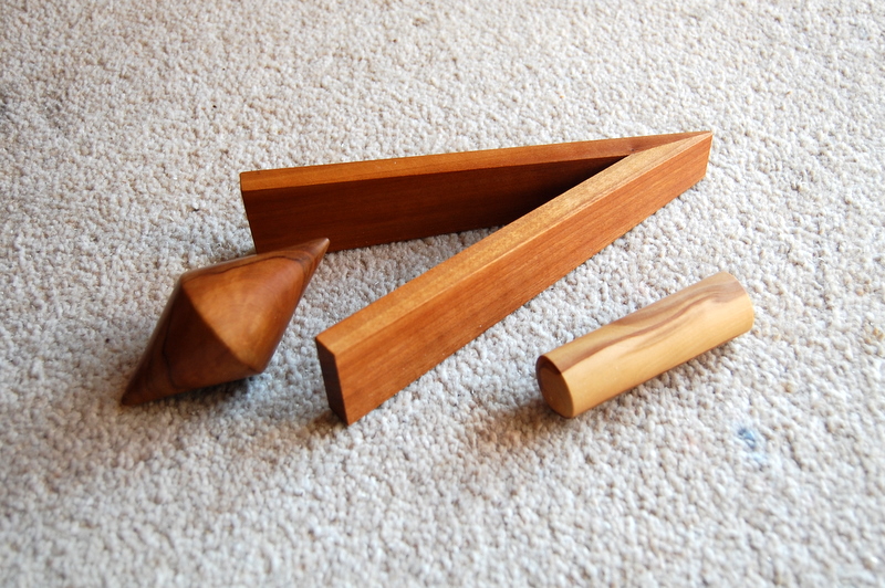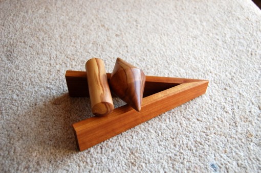 While on the subject of the apparently impossible, here’s another teasing puzzle that woodworkers can make to annoy their friends. It consists of 3 pieces: a cylinder, a symmetrical double cone and an inclined plane.
