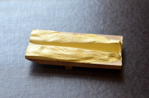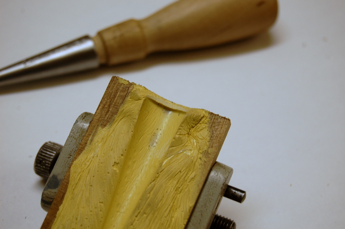 In the end, I got around this difficulty by casting a mould out of the sort of two-part wood filler that sets hard in about 30 minutes. I’ve written about this technique for holding awkwardly shaped object before (scroll down in the Tools and Jigs section of the website) so I won’t go into it in detail here. But briefly, you mix a generous quantity of the filler, spread it on a board (in this case a thin piece of wood of a size that would fit into an Eclipse honing jig), cover with a layer of cling film, and press the object you want to mould into it, holding it place with a weight or a clamp until the filler sets. Then, of course, you can take it out and get rid of the cling film.