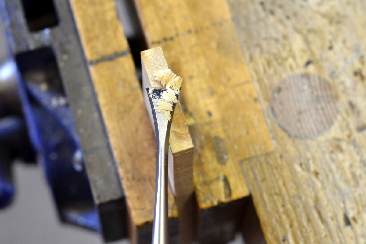 After it arrived, I honed it, maintaining the 25° angle of the original grind. Perhaps it was my lack of skill – keeping such a small bevel flat on the stone wasn’t easy – but I never managed to get it properly sharp. What’s more, the edge that I did achieve didn’t stand up to use on hardwoods.