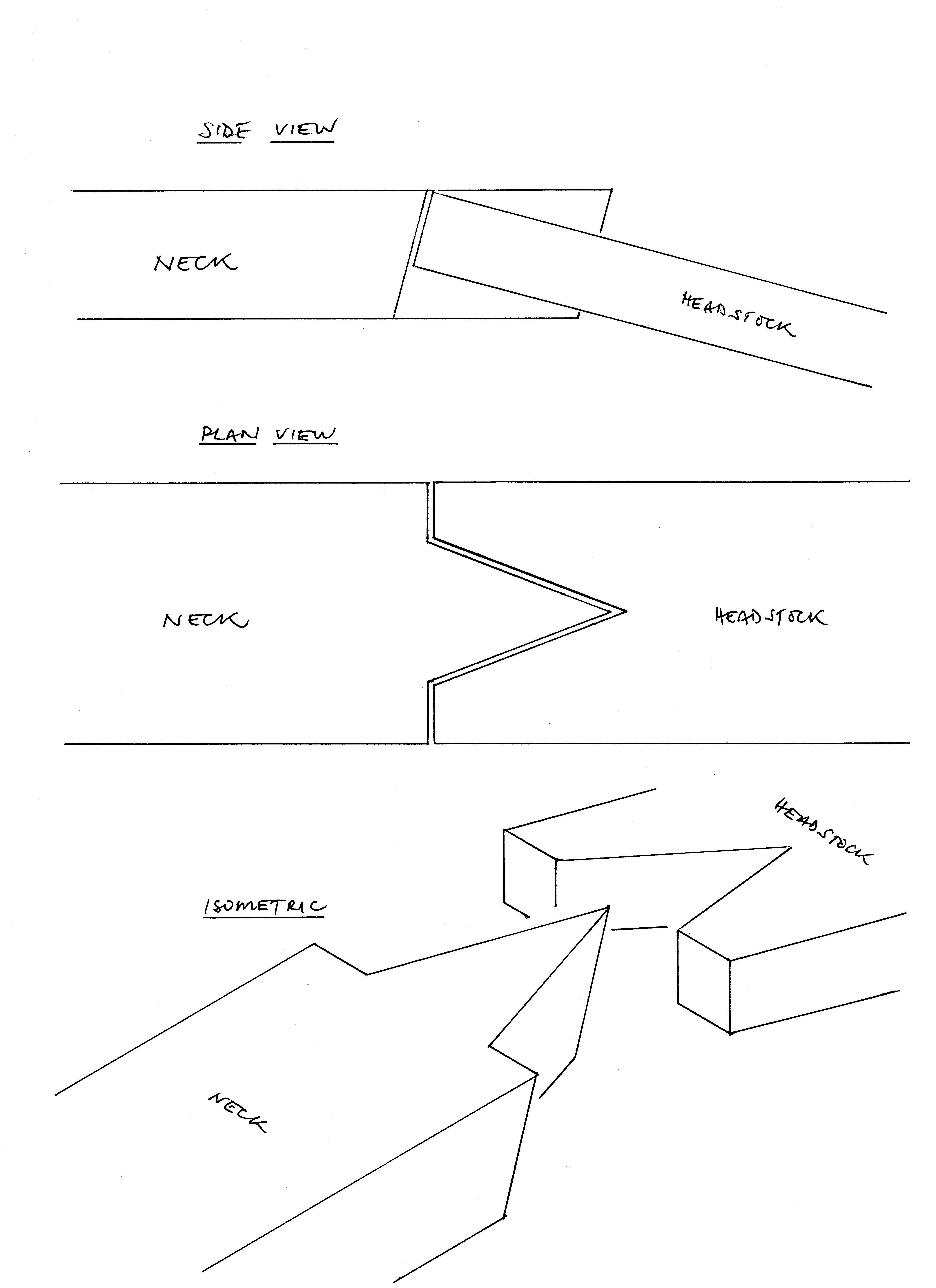As you can see, there’s a problem at the apex of the V, where a shadow shows that the neck isn’t quite deep enough to fill up the whole of the female part of the joint in the headstock. (My stock of mahogany for necks is planed up at a thickness of 25mm which means that I always run into this difficulty.)
