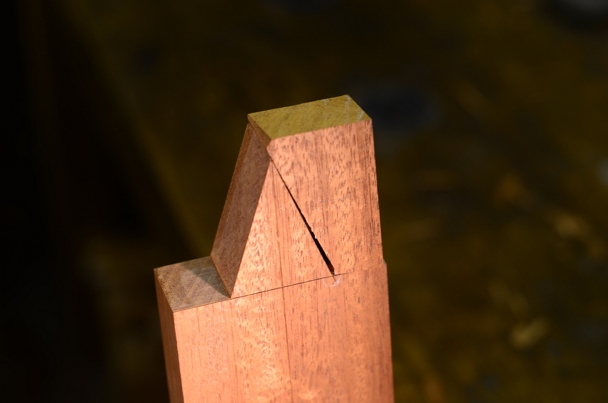 Now I cut the male part of the joint on the neck, starting with the angled shoulders. I chisel out a ramp for the saw in the usual way…