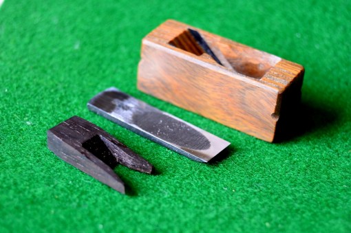 I had made several small planes for instrument-making too, but I’d always used the Krenov sandwich technique, which I’ve written about at length before. (See here and here. A few days ago, I tried Wouter’s method using a small block of lignum vitae, which I reckoned would have the right properties of hardness and self-lubrication.