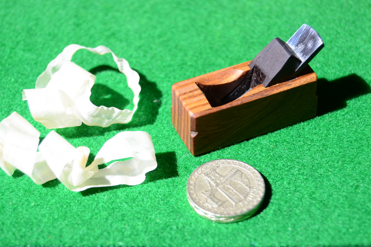 This is what I managed to come up with. The coin, £1 sterling, 22.5mm (≈7/8 inches) in diameter, is there to give an idea of scale; the long shavings prove that plane actually works.