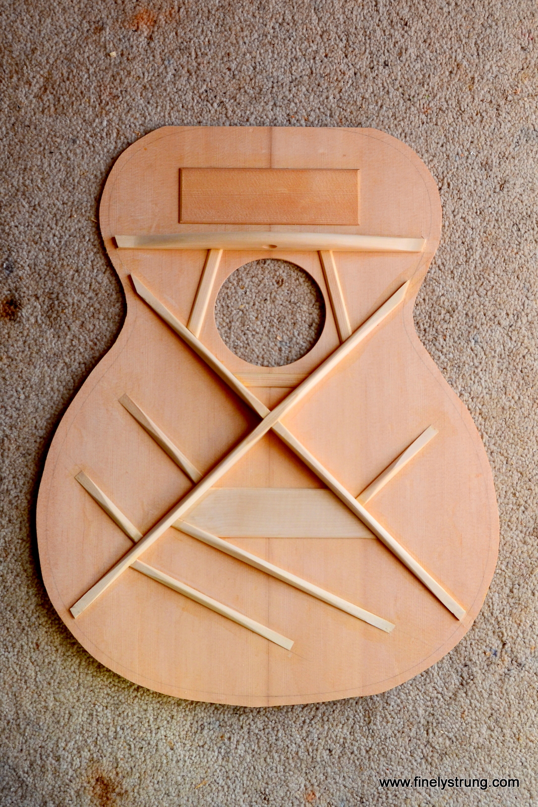 I’d made a cutaway version of this guitar a couple of years ago (photographs here) but, this time, I modified the design to have the neck meet the body at the 12th rather than the 14th fret. This means moving the bridge about 30mm down the soundboard and narrowing the angle between the two arms of the X brace slightly.
