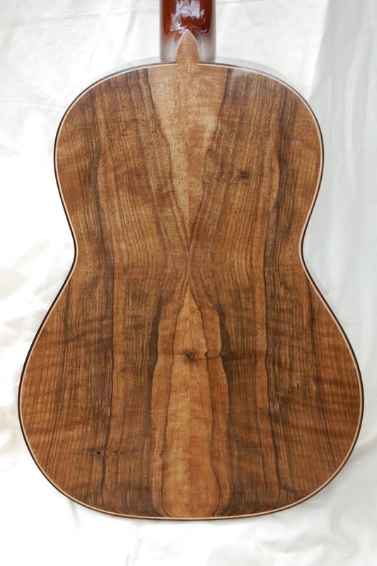 I made this guitar in 2007. The soundboard is European spruce and the back and sides are English walnut. The headstock veneer, bridge and rosette are laburnum and the guitar is bound with rosewood.