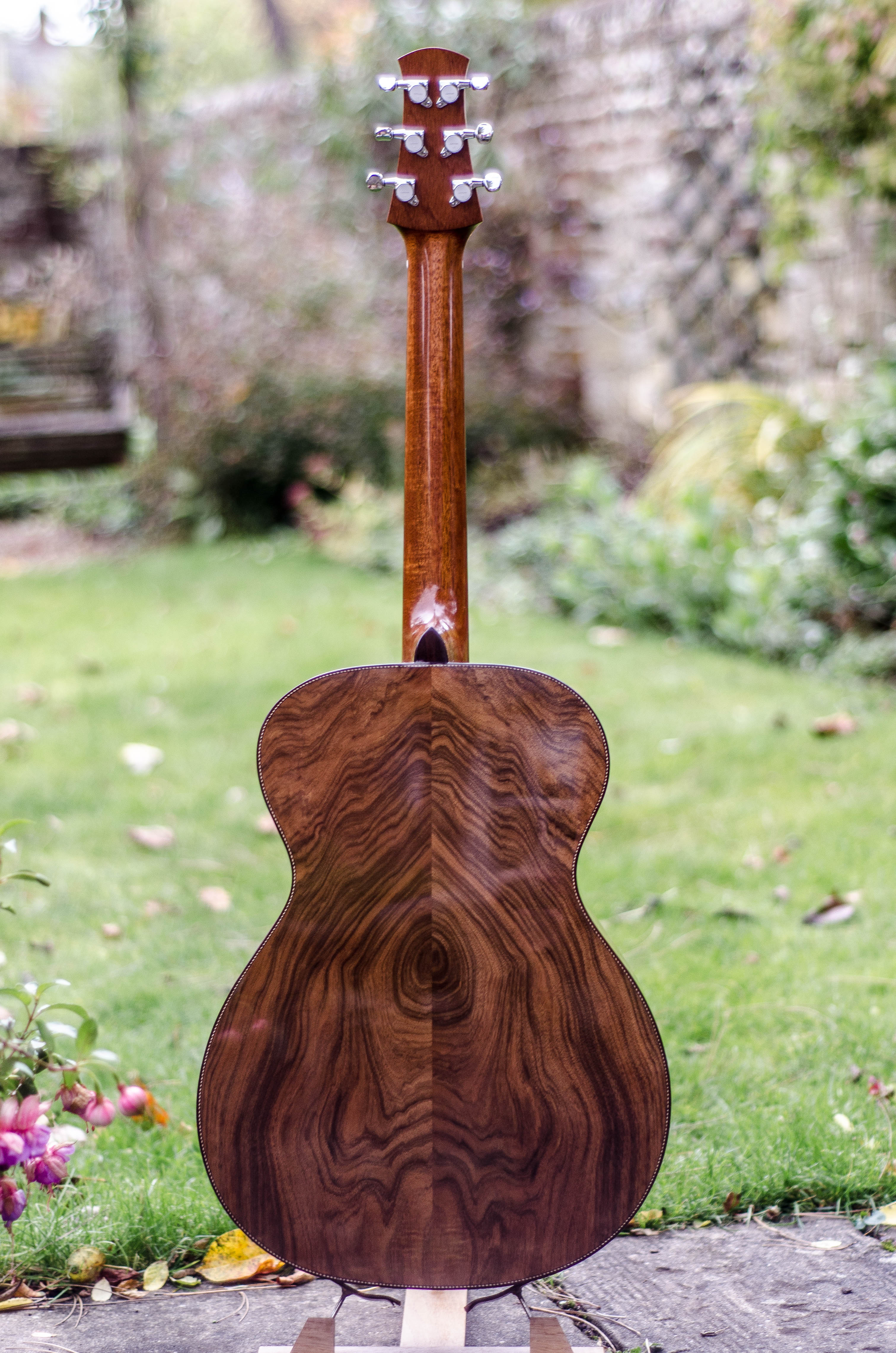 OO size, X-braced, steel-string guitar with 12 frets to the body, made in English walnut and Sitka spruce at the end of 2014.