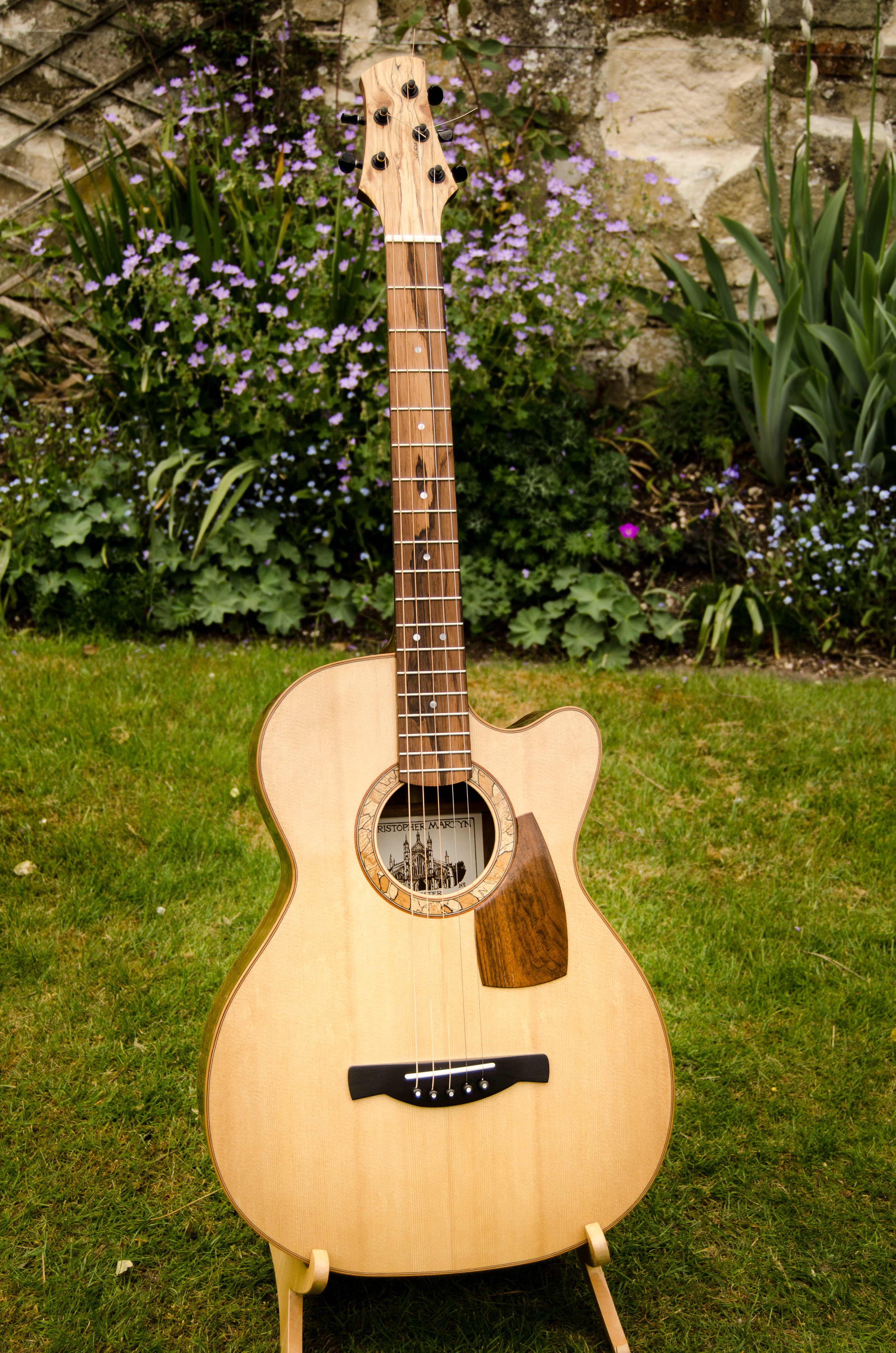 Specially commissioned by New Zealand guitar player Tim Cundy, this 5 string cutaway is designed to be played with open G tuning (that is G D g b d going from 5th to 1st string). It was made of English walnut with a Sitka spruce top and pear-wood bindings.