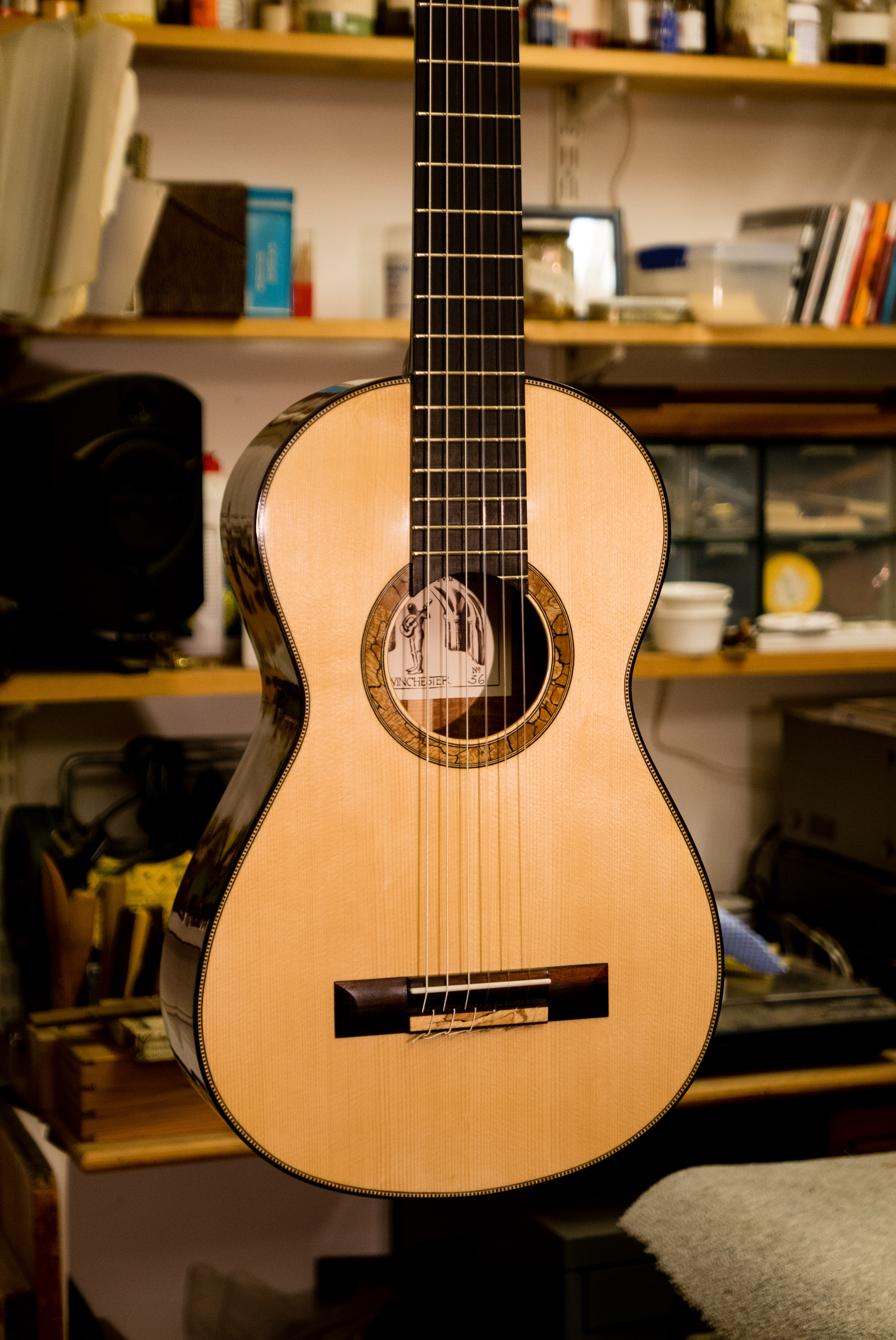 I finished this small guitar at the end of 2015. It’s loosely based on an instrument made by Torres in 1888 but has a slightly longer scale length than the original at 613.5mm. The top is spruce and the back and ribs are rippled mahogany.