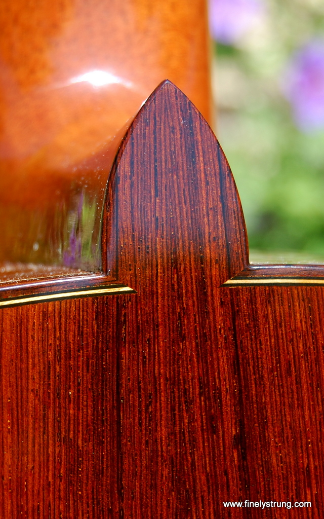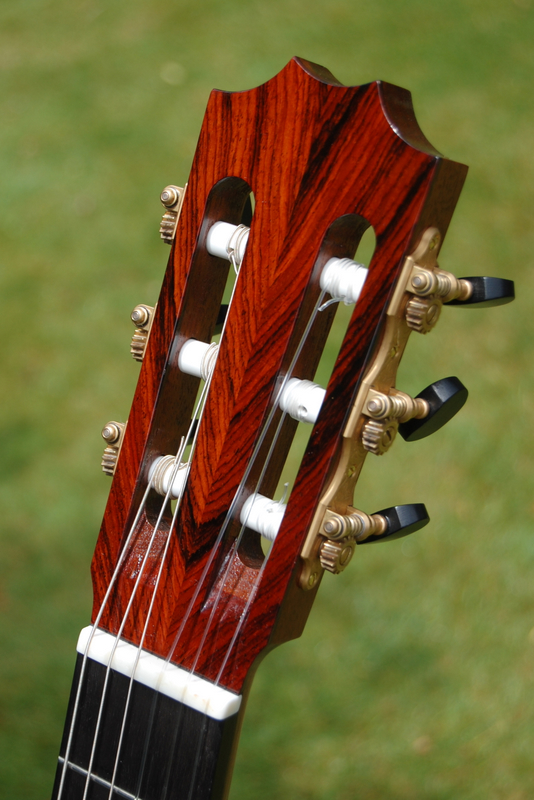 This classical guitar, loosely based on an instrument by Hernández y Aguado, was finished in July 2008. It has a spruce top inlaid with a rosette of laburnum. The back and ribs are cocobolo and the instrument is bound with ebony.