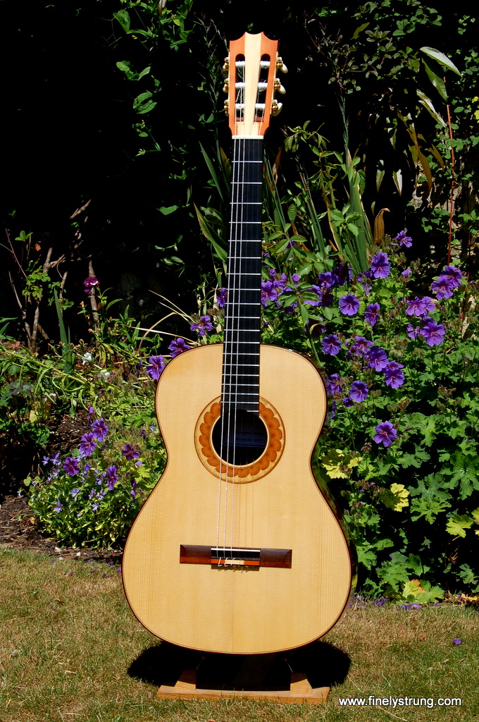 A smaller guitar, based on an instrument by Herman Hauser, with a scale length of 630mm. The soundboard is spruce and the back and ribs are of Madagascan rosewood (Dalbergia baronii). The bindings and bridge are of Rio rosewood and the rosette and headstock veneer are of English yew.