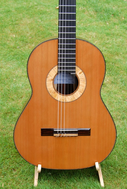 This guitar, completed in 2012, is made in satinwood with a spruce soundboard – click here for more photographs. Gill Robinson plays excerpts from Song of Dawn by Vincent Lindsey-Clark, and Canarios by Gaspar Sanz.